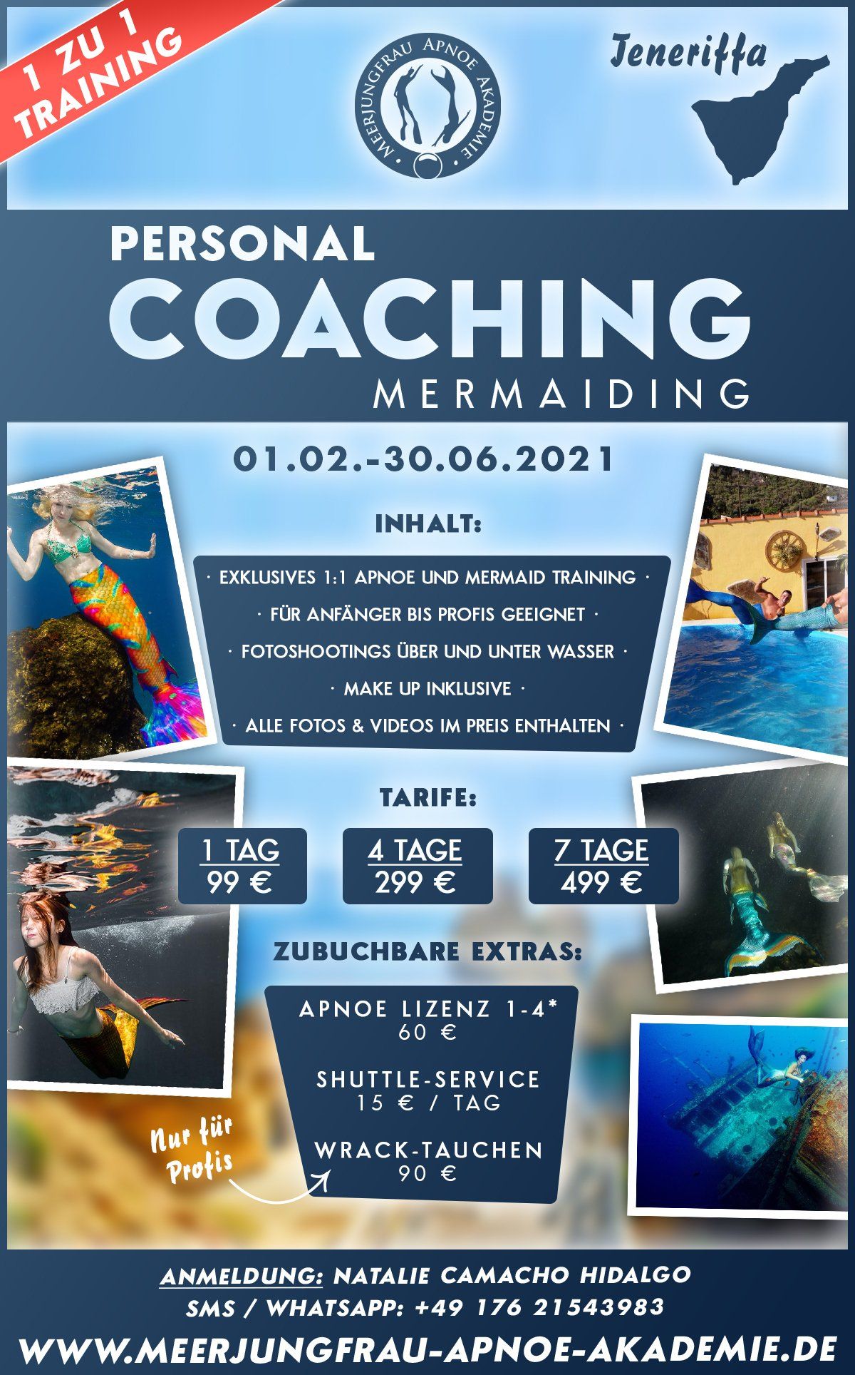 Exklusives 1:1 Apnoe und Mermaid Training für Anfänger bis Fortgeschrittene. Fotoshootings über und unter Wasser halten Dein Training fest. Das passende Make-Up, sowie alle Fotos & Videos sind im Preis enthalten.